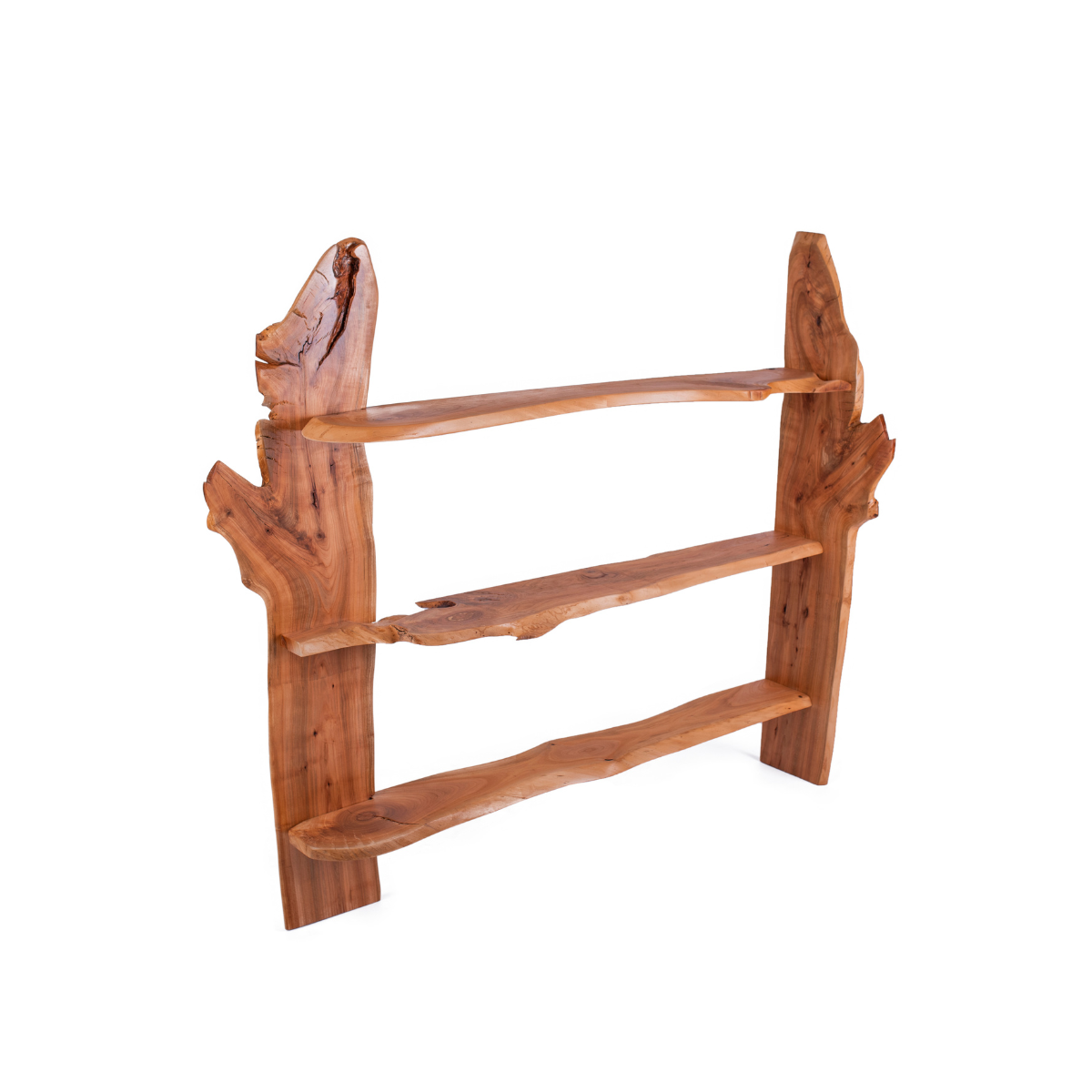 Wyjątkowy regał ścienny wykonany z drewna wiśniowego to połączenie naturalnej elegancji i artystycznego rzemiosła. Jego trzy przestronne półki wyróżniają się niepowtarzalnym kształtem desek, które zachowały organiczne linie drewna, podkreślając jego autentyczny charakter. Unikatowe wybarwienie, z ciepłymi tonami i widocznym usłojeniem, dodaje regałowi głębi oraz naturalnego uroku.